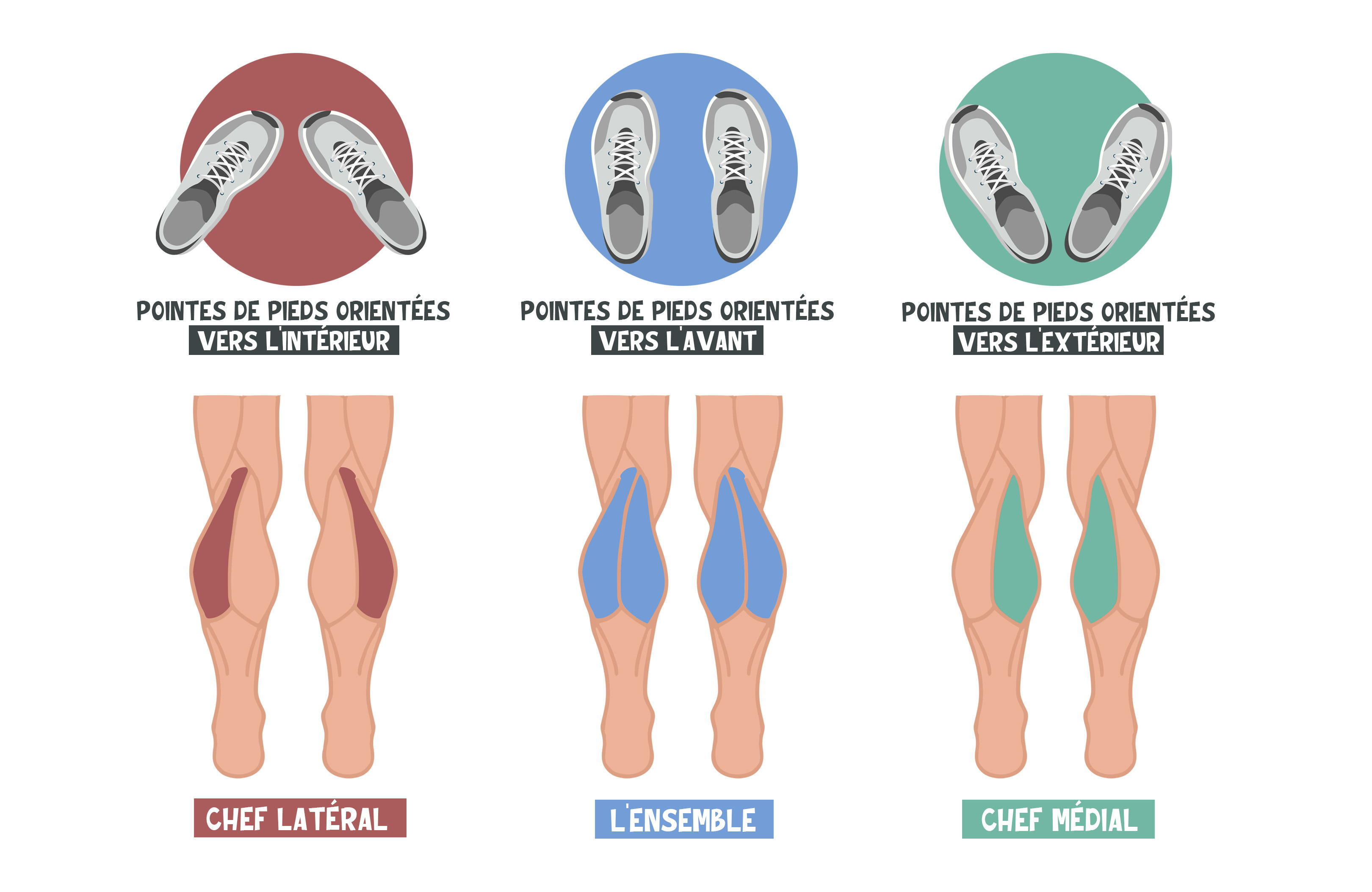 Enfin, lorsque les pointes de pieds sont orientées vers l’extérieur, cela sollicite davantage le chef médial des gastrocnémiens (partie interne des mollets)